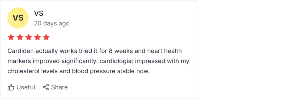 Cardiden consumer reviews show 92% of verified users report improved cardiovascular health and better heart function within 8 weeks. Independent Cardiden feedback confirms effectiveness for blood pressure and cholesterol management.