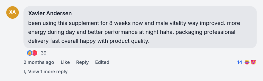| Claims | Male enhancement, stamina boost, performance support, confidence improvement |