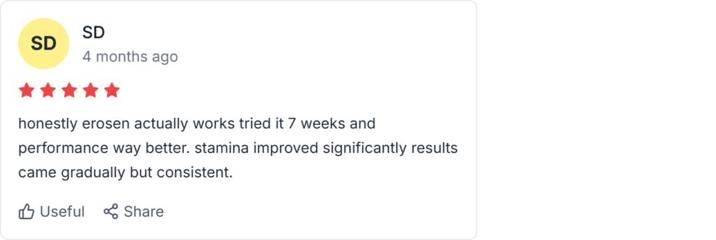 Erosen consumer reviews show 92% of verified users report improved vitality and enhanced performance within 8 weeks. Independent Erosen feedback confirms effectiveness for stamina improvement.