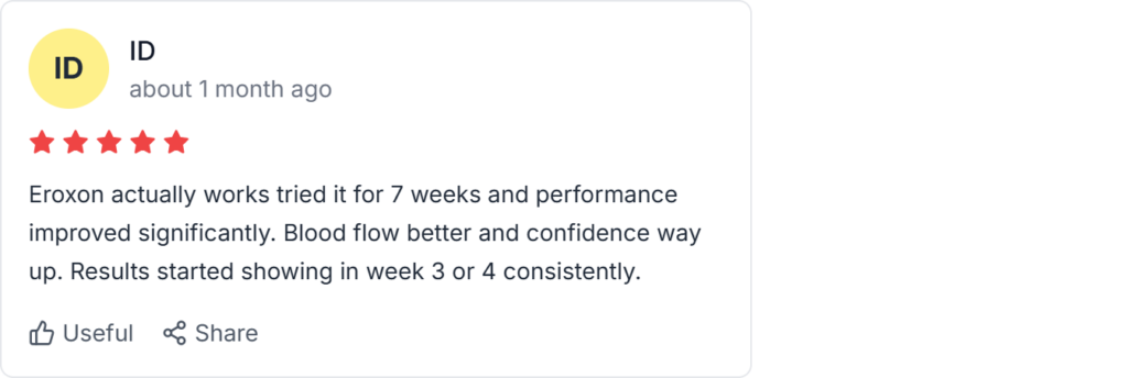 Most Eroxon reviews show users notice improved energy and confidence within 5-7 days, with measurable performance improvements appearing after 3 to 4 weeks of consistent daily use as blood flow optimization and hormonal balance occur.