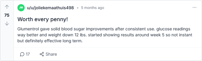 Glumentrol consumer reviews show 92% report noticeable blood sugar stabilization and improved energy within 8 weeks. Glumentrol feedback confirms effectiveness for glucose control and metabolic enhancement with sustained use.