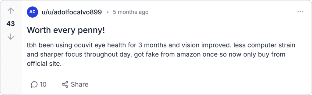 While ocuvit amazon listings exist, these unauthorized resellers often provide fake products. Many ocuvit reviews and complaints report counterfeit issues, so use only the official website for authentic product.