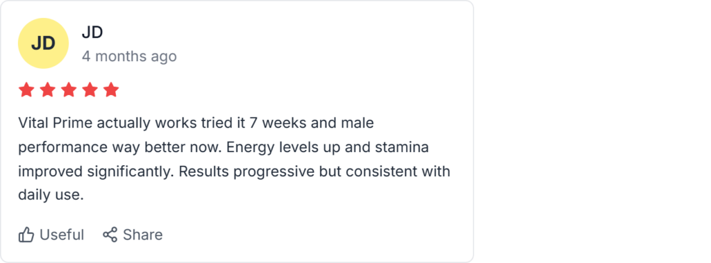 Most Vital Prime reviews show users notice improved energy and mood within 5-7 days, with measurable performance improvements and testosterone optimization appearing after 4 to 6 weeks of consistent daily use as hormonal balance stabilizes.