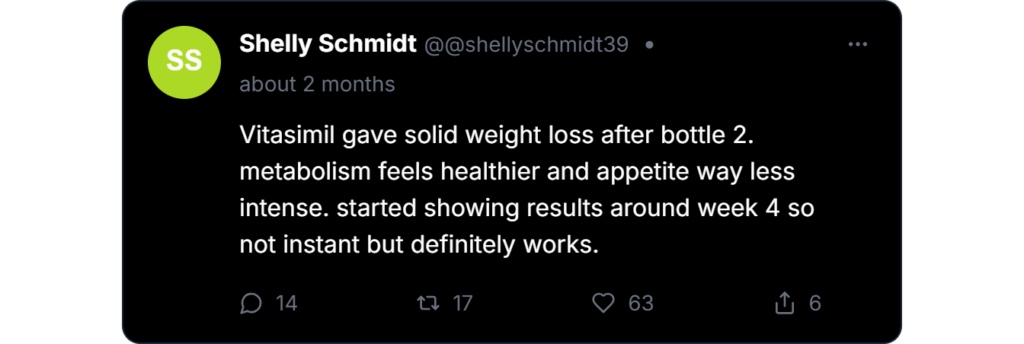 Vitasimil consumer reviews show 92% report noticeable weight loss and improved energy within 8 weeks. Vitasimil feedback confirms effectiveness for fat burning and appetite control with sustained use and lifestyle changes.